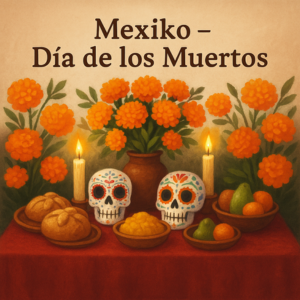 V Mexiku sa na zosnulých spomína s radosťou, farbami a hudbou. Dia de los Muertos, teda Deň mŕtvych, patrí medzi najvýznamnejšie sviatky v celej krajine a spája prvky kresťanskej tradície s dávnymi aztéckymi rituálmi. Ľudia veria, že duše zomrelých sa v tieto dni vracajú navštíviť svojich blízkych, a preto pre nich pripravujú oltáre zvané ofrendas, zdobené fotografiami, sviečkami, kvetmi a obľúbenými pokrmami zosnulých. Ulica zaplní farebné masky lebiek (calaveras), papierové dekorácie, sprievody aj tanec. Typickým symbolom je oranžový nechtík (cempasúchil), ktorého vôňa má pomôcť dušiam nájsť cestu späť domov. Celý sviatok je oslavou života a smrti – plný úcty, ale aj radosti a nádeje, že smrť je len ďalšou kapitolou ľudskej existencie.