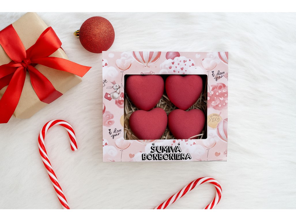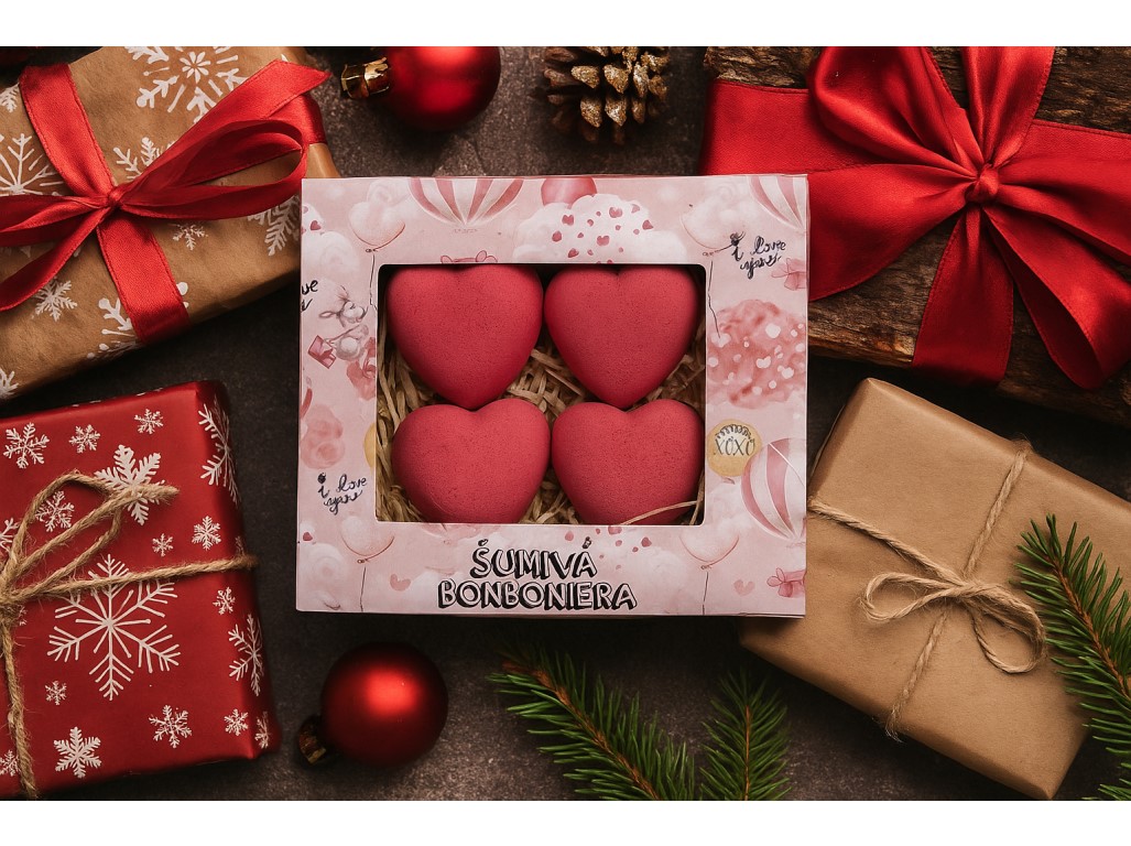 Kozmetický balíček z lásky je súprava plná šumivých a penivých bômb do vane v tvare srdca. Otvorte dvere do sveta relaxácie a romantiky s našou šumivou bonboniérou. Každý kus tejto lahodnej kolekcie je ako obláčik radosti, ktorý sa rozplýva vo vani a poskytuje vám nezabudnuteľný zážitok plný lásky a harmónie. Ideálne pre tých, ktorí milujú luxusný kúpeľný zážitok. Skvelý darček na Valentín alebo na ľubovoľnú príležitosť z lásky. Šumivá bonboniéra je kozmetická súprava, ktorá obsahuje šumivé bomby do vane 4 x 30 g. Šumivé bomby Bohemia Gifts vyvíjame a vyrábame ručne v Českej republike zo surovín, extraktov a olejov najvyššej kvality šetrných k pokožke. Všetky produkty nechávame dôkladne dermatologicky testovať, nepoužívame parabény a ctíme potreby citlivejšej pokožky. Naša kozmetika je plne vegánska. Použitie: Hustá, alebo len niekoľko našuchorených ostrovčekov na hladine? Intenzitu peny z šumivej bomby si môžete namiešať podľa svojho gusta! Najbohatšiu penu docielite, pokiaľ vhodíte bombu do prúdu teplej vody v pomere 100 g na 50 litrov kúpeľa. Po kúpeli sa nezabudnite osprchovať čistou vodou. Napustite teplú vaňu. Vhoďte bombu do vane. Užívajte si kúpele a sledujte, ako sa váš stres postupne rozplýva... Užite si okamihy intenzívneho uvoľnenia s našou šumivou bonboniérou. Zloženie: Sodium Bicarbonate, Citric Acid, Sodium Chloride, Polysorbate 20, Tapioca Starch, Sodium Lauryl Sulfoacetate, Olive Oil Glycereth-8 Esters, Propylene Glycol, Rosa Canina Fruit Extract, Glycerin, Aqua, Rosa Centifolia Flower Extract, Potassium Sorbate, Sodium Benzoate, Lactic Acid, Parfum, Citronellol, Eugenol, Geraniol, Hydroxycitronellal, Linalool, CI 16185, CI 14720