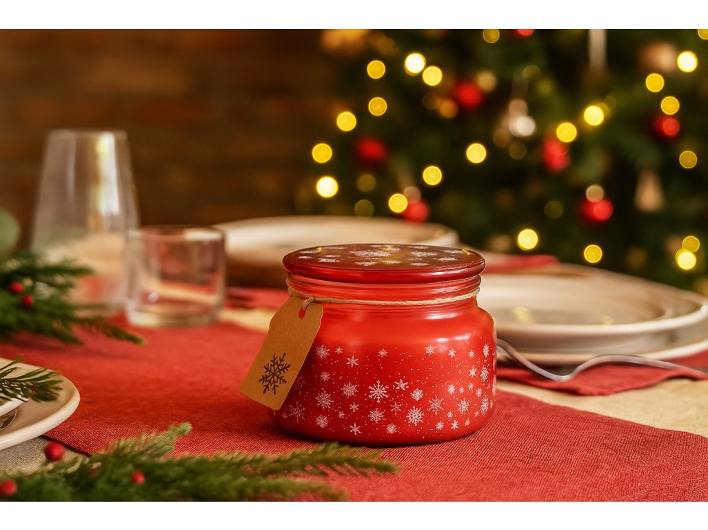 Červeno-biela vonná sviečka Emocio Magic Snowing v skle so skleneným viečkom prevonia domov jemnou zimnou vôňou a vnesie do interiéru teplú a sviatočnú atmosféru.