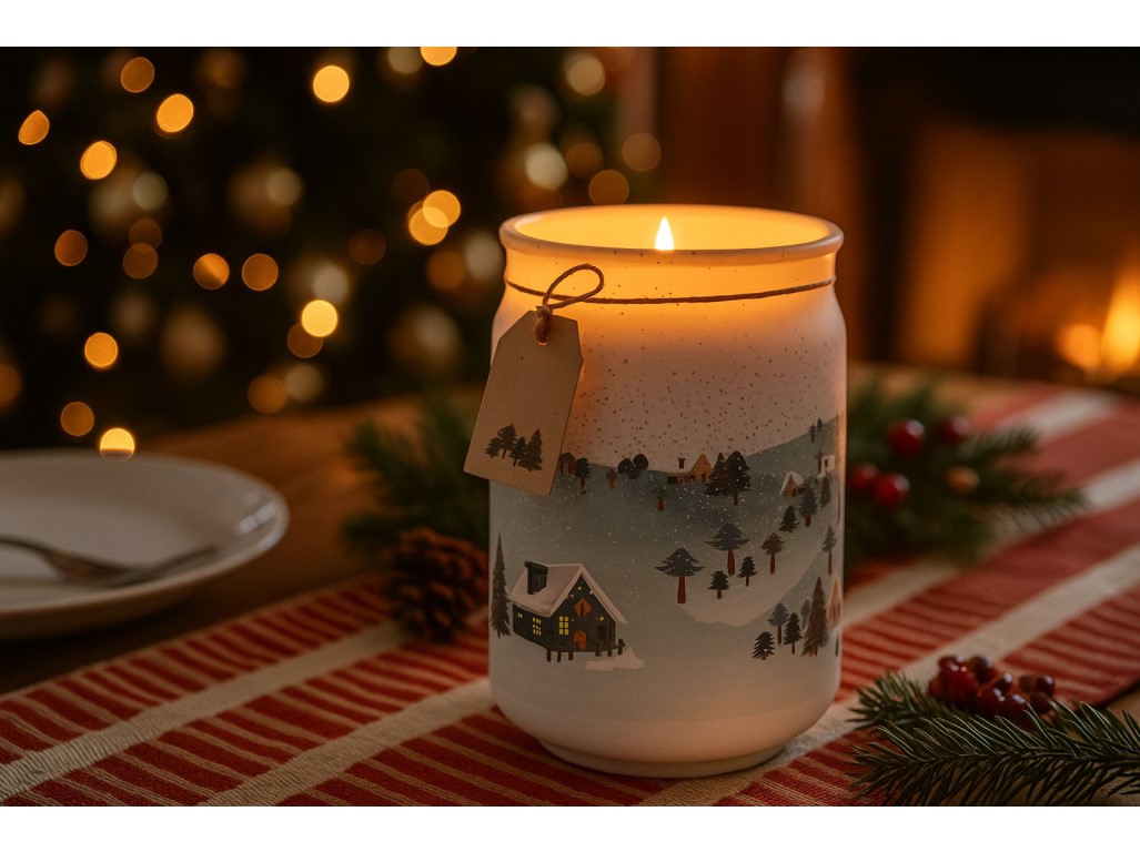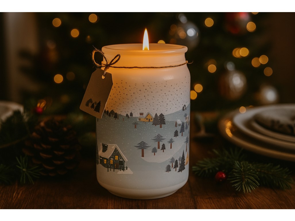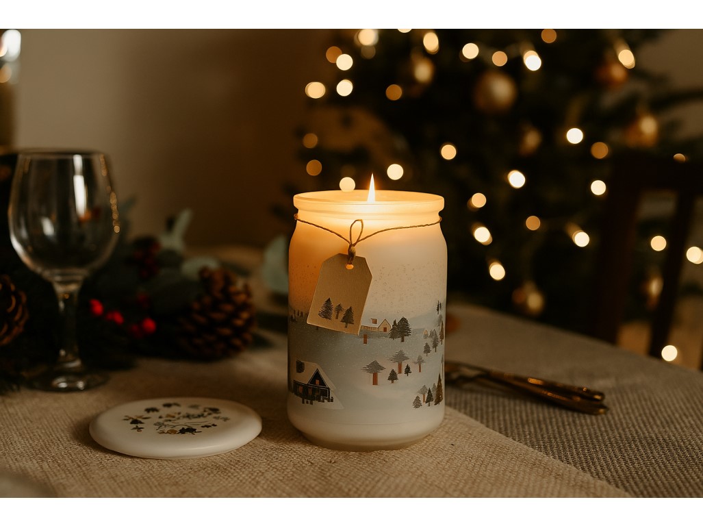 Vonná sviečka Emocio Winter Wonderland v skle so skleneným viečkom prináša do domova jemnú zimnú vôňu a kúzelnú atmosféru zasneženej dedinky.