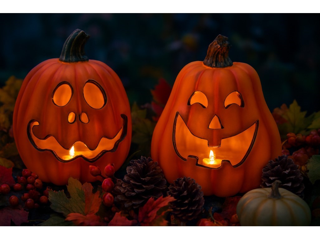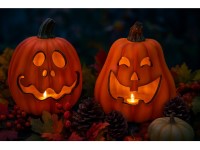 Detailne spracovaná tekvica z pevného polyresinu so zabudovaným LED svetlom. Príjemne žiari teplým svetlom a dodá každému večeru kúzelnú atmosféru. Funguje na batérie (nie sú súčasťou), vhodná na vnútorné použitie.