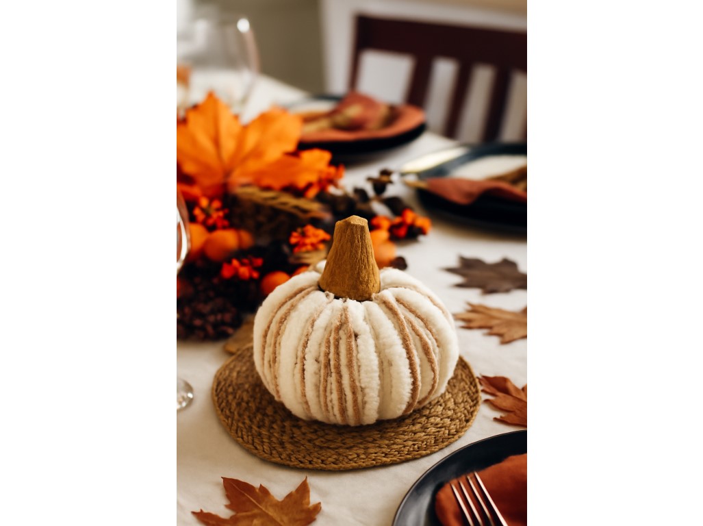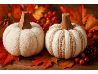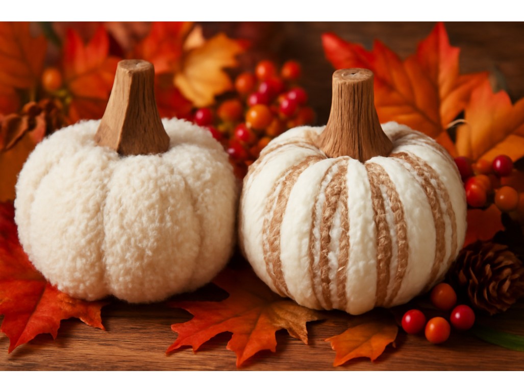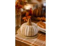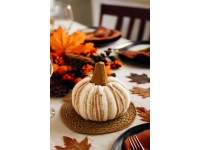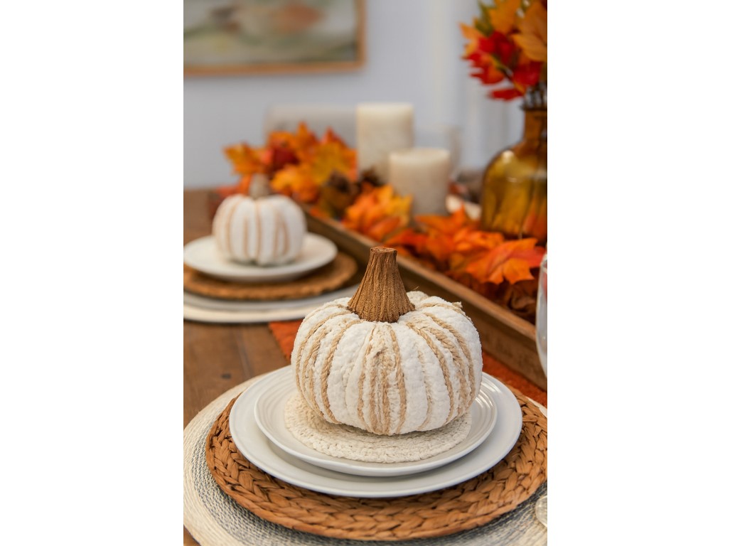 Ručný vzhľad, hebká bavlna, tlmené tóny bielej a hnedej – tieto pletené tekvice sú štýlovou alternatívou ku klasickej keramike. Skvele vyzerajú spolu aj v skupine s prírodnými materiálmi.
