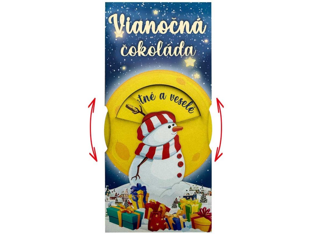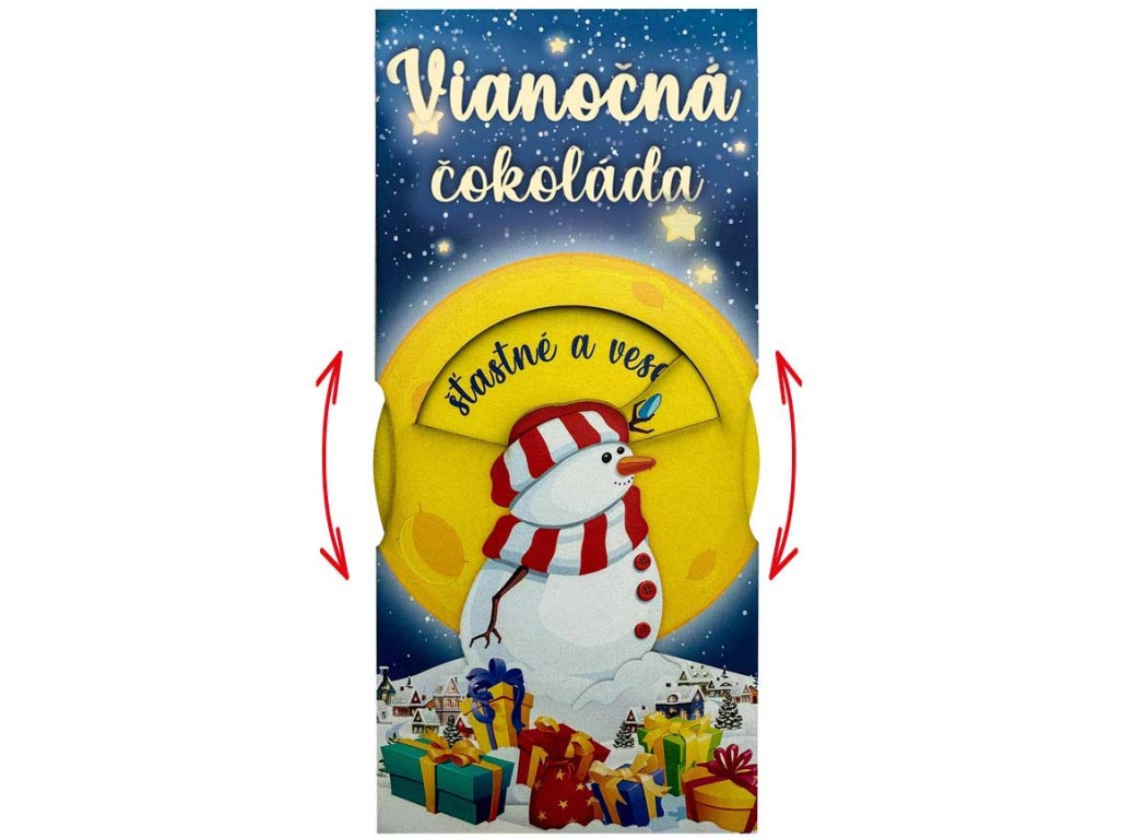 Vianočná čokoláda so snehuliakom je skvelým spôsobom, ako priniesť do sviatočnej atmosféry radosť a sladkú pochúťku. Darujte svojim blízkym sladký vianočný darček s prianím. Špeciálny obal má interaktívnu časť s otočným kolieskom. Otáčaním kolieska na obale sa vytvorí dojem, že snehuliak píše nápis „šťastné a veselé“ a ďalším pootočením ho opäť zmaže. Tento špeciálny a originálny obal robí z čokolády úplne dokonalý vianočný sladký darček pre vašich blízkych. Obsah kakaovej sušiny v mliečnej čokoláde najmenej 30%. Môže obsahovať stopy arašidov, iných škrupinových plodov, lepku a vajec. Hmotnosť: 100 g, Rozmer obalu: 23 x 10,5 cm