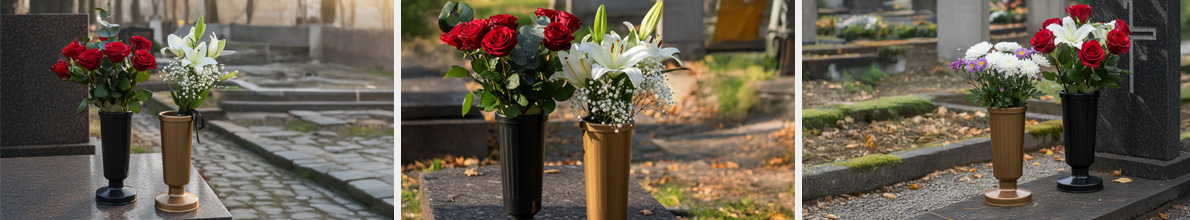Jednoduché plastové cintorínske vázy, ktoré zaistia bezpečné a praktické umiestnenie kvetov na hroboch. Funkčné a spoľahlivé riešenie pre každé pietne miesto.