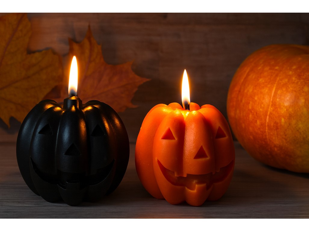 Oranžová sviečka v tvare tekvice pre okamžitú jesennú atmosféru.