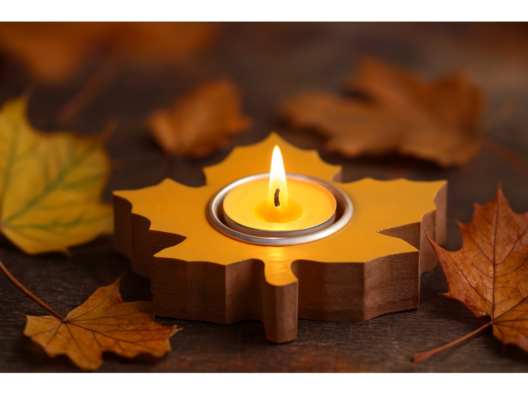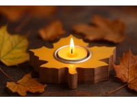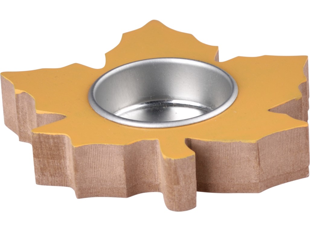 Drevený svietnik v tvare javorového listu na čajovú svíčku v pastelovej oranžovej farbe. Ozdobte svoj interiér jesennými farebnými svietnikmi v tvare listu. Vyzerajú skvele v kombinácii s ďaľšími farebnými variantami.