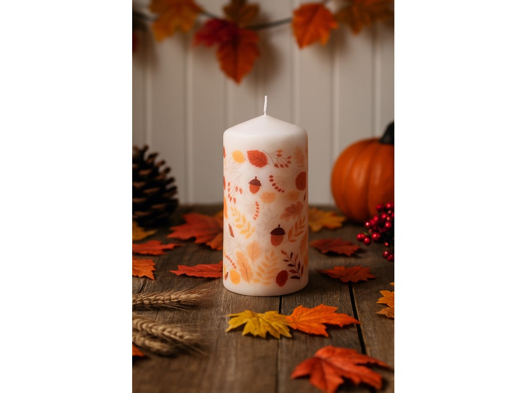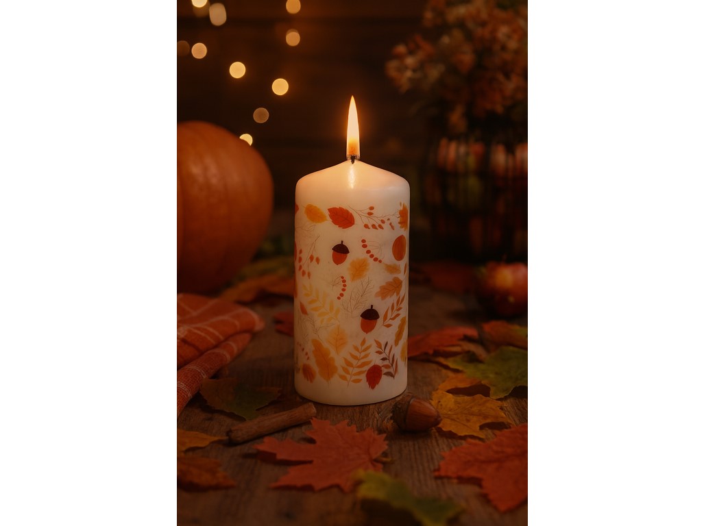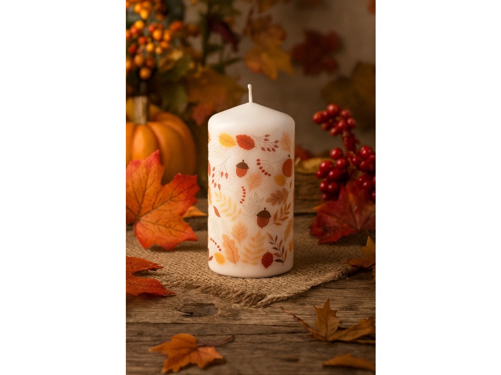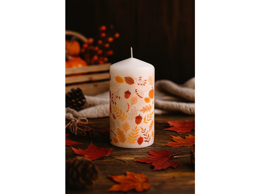 Klasická valcová sviečka s jemnou jesennou vôňou a potlačou lístia. Skvele doplní sezónne dekorácie a navodia hrejivú atmosféru. Výška 12 cm, priemer 6 cm.
