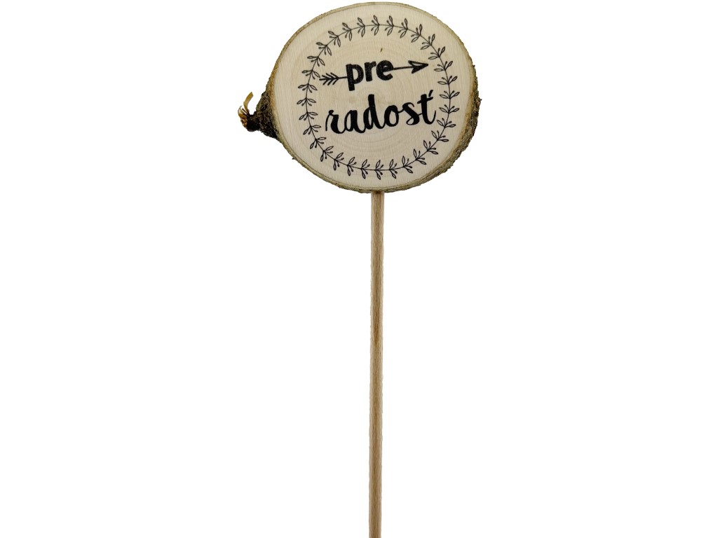 Drevený zápich do kvetináča, darčeka alebo k bylinkám s potlačou - Pre radosť. Priemer kolieska je 5 - 8 cm, výška zapichovátka je približne 30 cm.